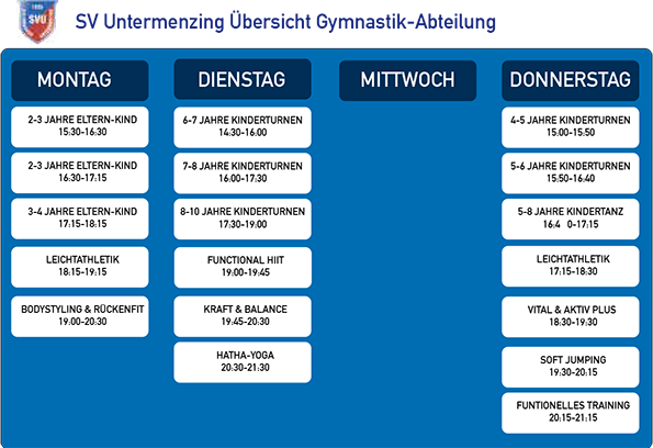 Schau gerne auf ein kostenloses Probetraining vorbei – melde dich vorab bei unserer Abteilungsleiterin oder direkt bei der entsprechenden Kursleiterin unverbindlich an. Wir freuen uns auf dein Kommen!
